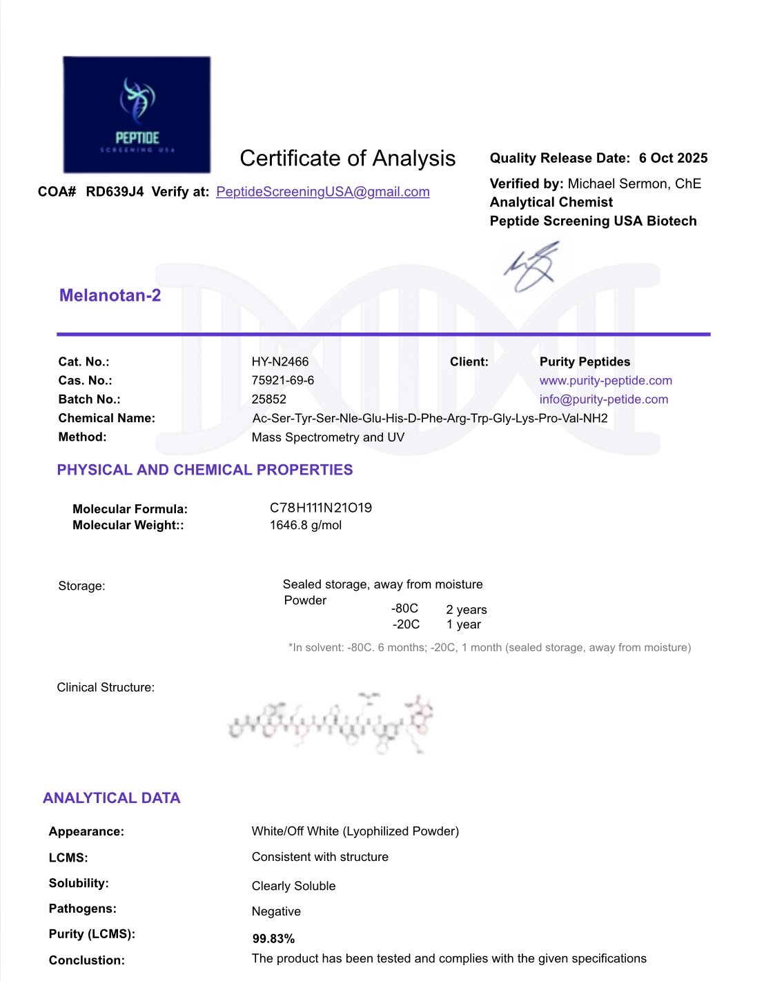 Melanotan II is a synthetic analogue of the naturally occurring alpha-melanocyte-stimulating hormone (α alpha 𝛼-MSH). Made in lyophilized form.