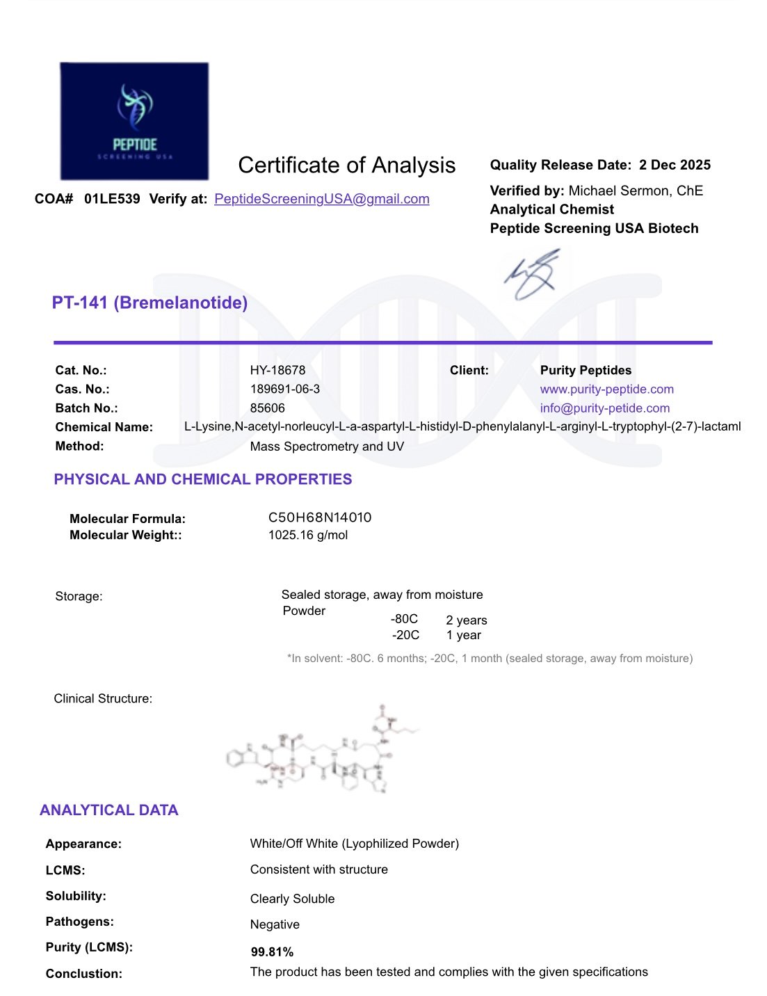 Bremelanotide peptide (melanocortin receptor agonist). Made in lyophilized form.